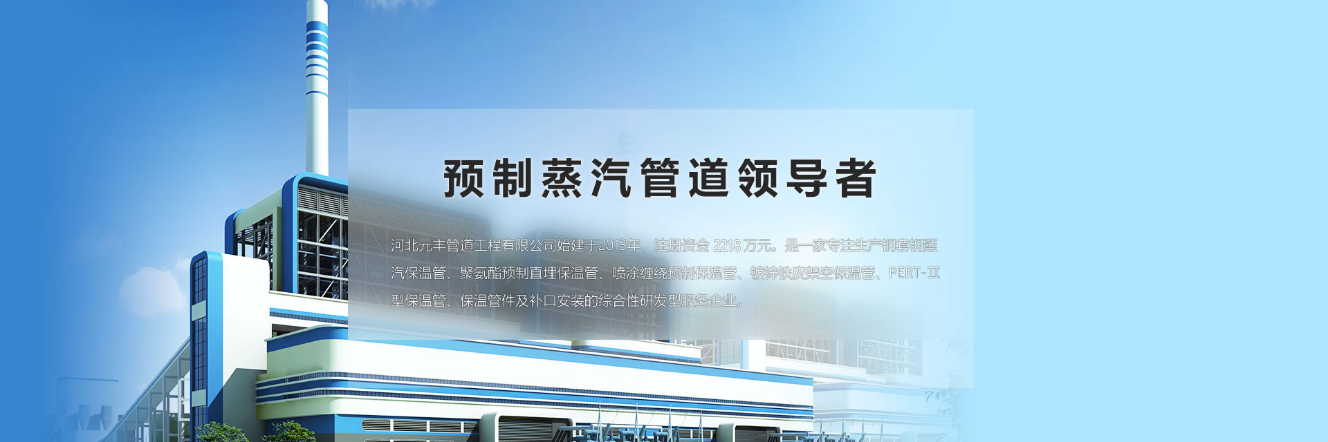 公司在河北、內蒙、天津、遼寧均有生產基地,總占地面積500余畝。公司產品覆蓋中國以及蒙古、俄羅斯、中東、南非等20 多個國家和地區,產品主要應用于高溫蒸汽輸送、集中供熱、集中供冷等。 公司依靠先進的生產技術、完善的配套設備和供貨服務體系,為廣大客戶提供高標準的管道產品,為長輸管網運行保駕護航。